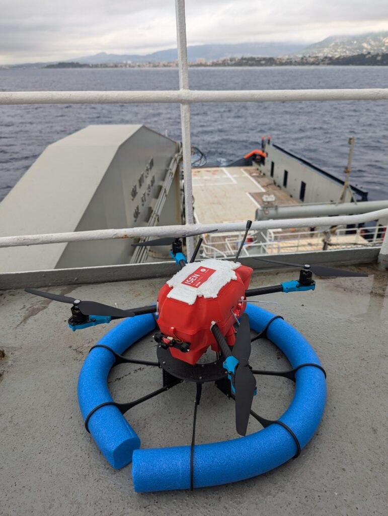 Le redécollage du drone n’a pas pu se faire à cause de multiples coupures rapides de la communication avec le PC de commande. Il a été récupéré manuellement au large.