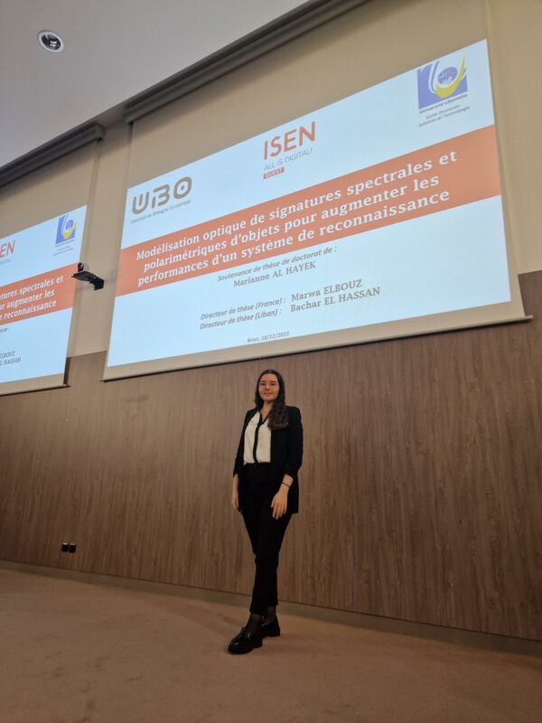 Marianne Al Hayek, doctorante au sein de l’équipe LSL – Light Scatter Learning – du LabISEN, laboratoire de recherche de l’ISEN Ouest, a soutenu sa thèse de doctorat lundi 18 décembre dernier. Celle-ci portait sur la Modélisation optique de signatures spectrales et polarimétriques d’objets pour augmenter les performances d’un système de reconnaissance et était dirigée par Marwa Elbouz, Enseignante-Chercheuse HDR à l’ISEN Ouest.